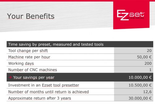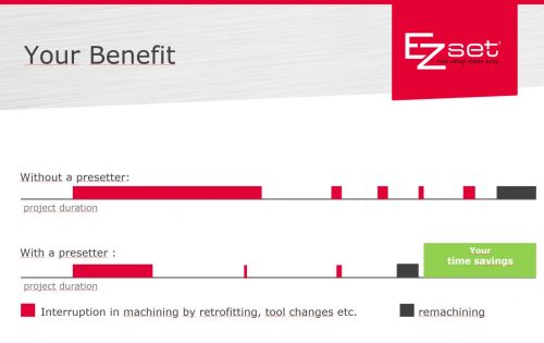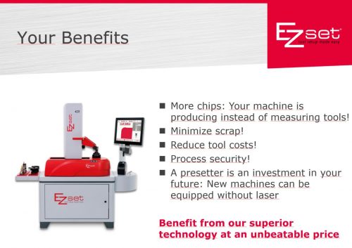 Precisely measured tools, optimized machine uptimes and longer tool service lives make sound financial sense. Your productivity will be boosted by at least 15%. EZset tool presetters pay for themselves in no time. They are easy to use, low-budget but high-performance.