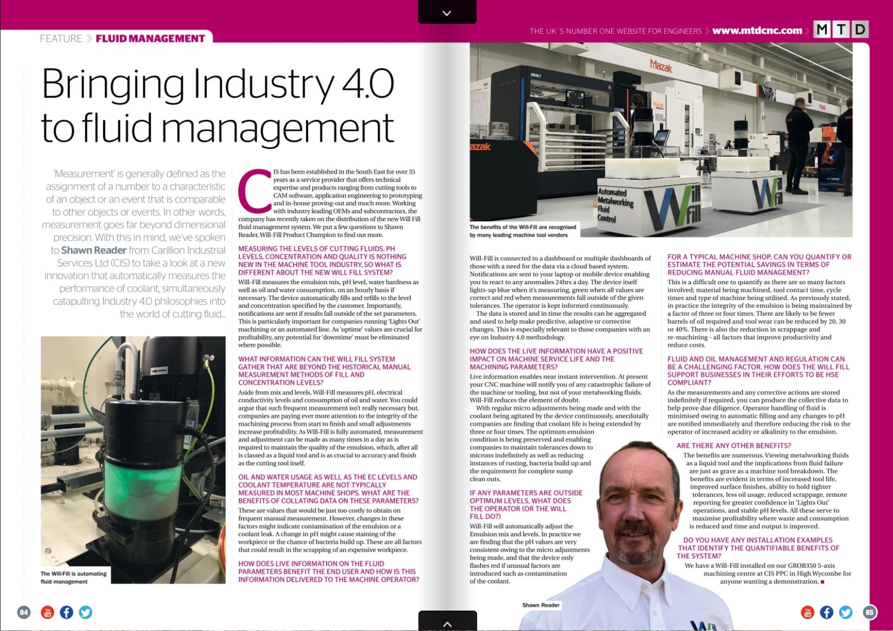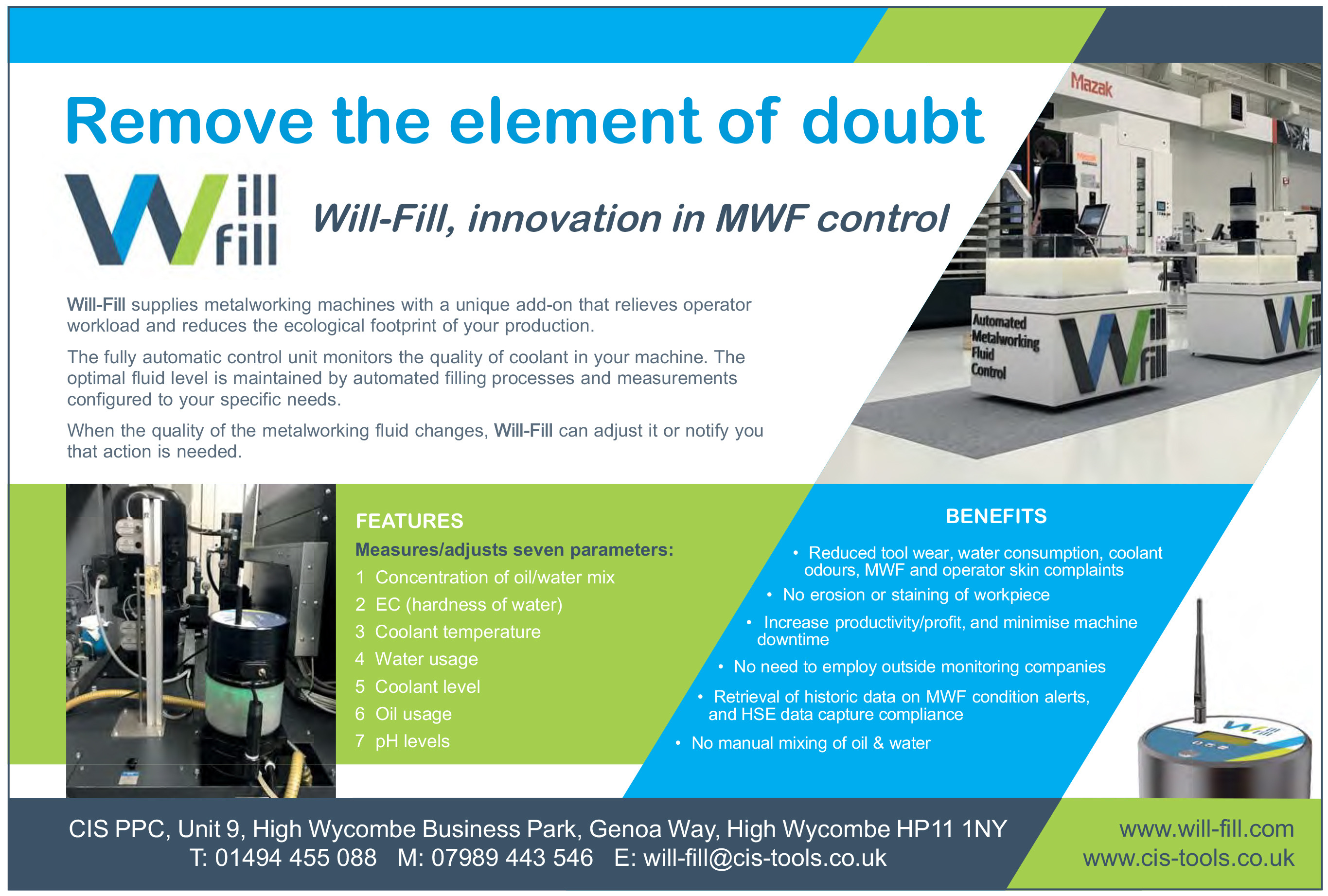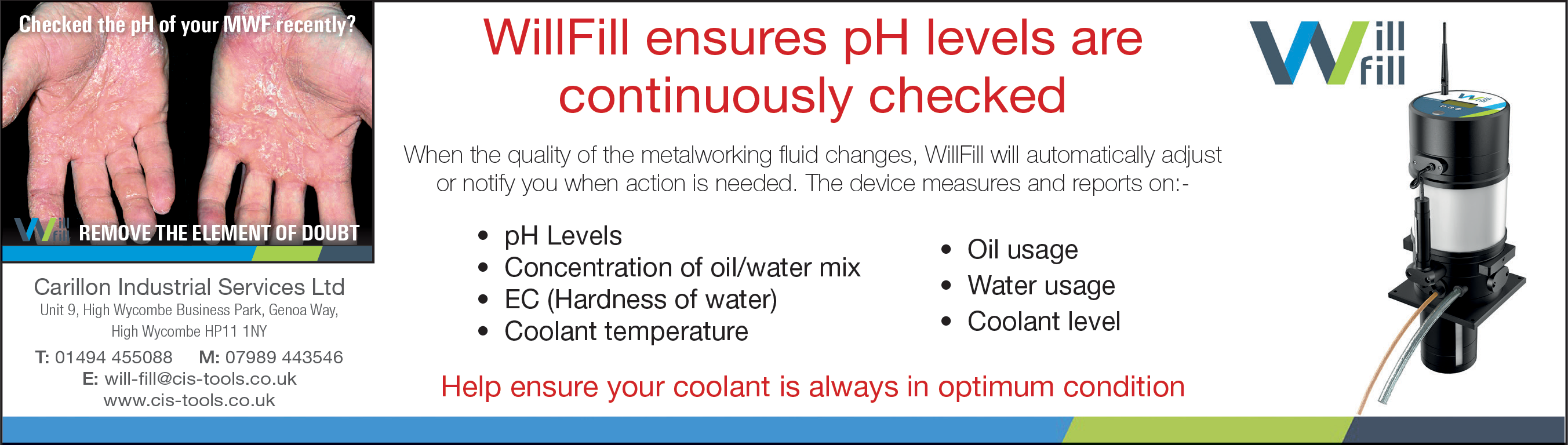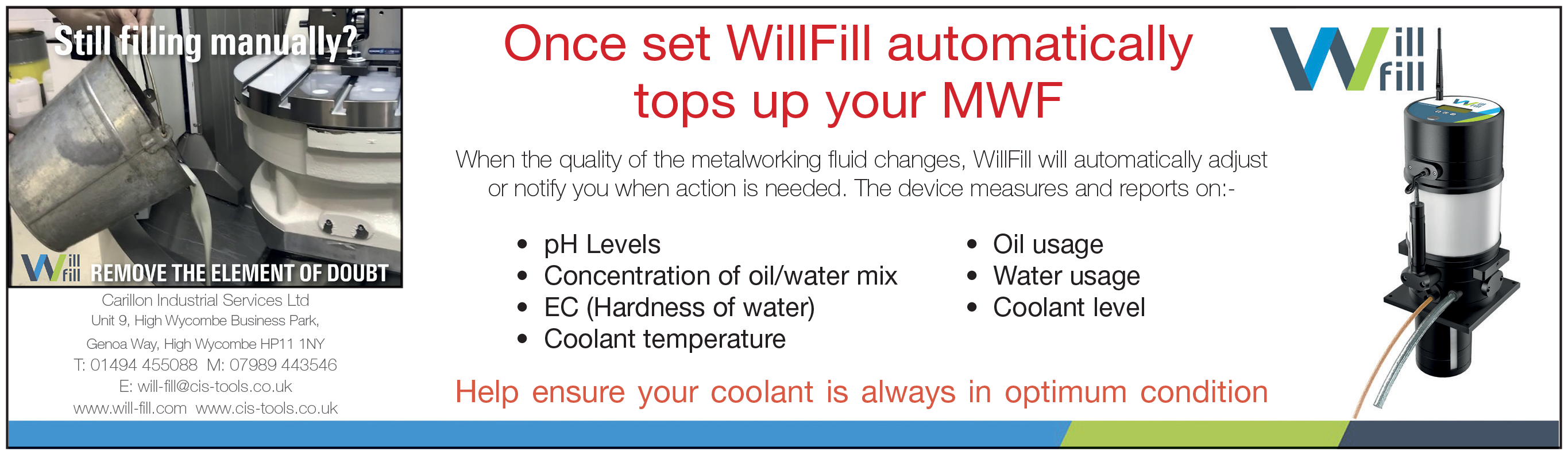Will-Fill is a patented and innovative solution that equips metalworking machines with a unique add on. Will-Fill monitors, reports on and adjusts the condition and mix of the metal working fluid, taking the guess work out of the process and improving operator effectiveness.